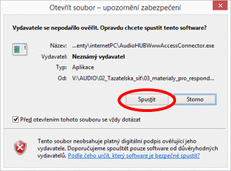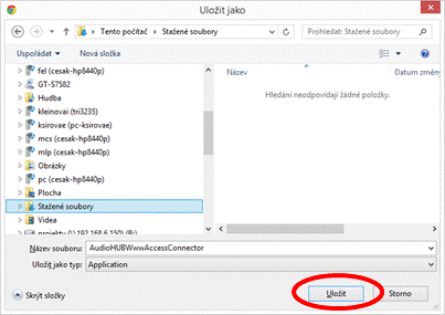 Po kliknutí na odkaz se otevře internetový prohlížeč (zde je to Google Chrome), který se zeptá, kam chcete soubor AudioHUBWwwAccessConnector.exe uložit (Obrázek 1). Vyberte tedy, prosím, umístění ve Vašem počítači, kam chcete soubor uložit, a klikněte na Uložit.
