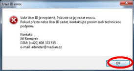 pak jste zadali User ID špatně. Klikněte na OK a zkuste jej zadat znovu (doporučujeme User ID z e-mailu zkopírovat stisknutím Ctrl+C a vložit pomocí Ctrl+V). Po správném zadání chybové okno zmizí.